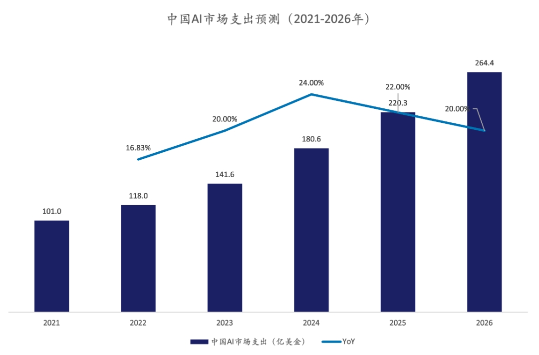 就平台层的关键技术来说, “生成式AI” 被Gartner列为2022年顶级战略技术之一,2022年也成为“生成式AI元年”。据彭博智库(Bloomberg Intelligence)最新发布的报告显示,生成式AI将引领全球AI市场进入十年期的快速增长潮,到2032年,生成式AI市场的规模将从2022年的400亿美元增长到1.3万亿美元,年均复合增长率达到42%。中国作为全球第二大经济体,在AI市场中也扮演着举足轻重的角色。IDC预计,2023年中国AI市场支出将增至147.5亿美元,约占全球总规模的1/10,预计到2026年中国AI市场将实现264.4亿美元市场规模,2021-2026五年复合增长率(CAGR)将超20%。