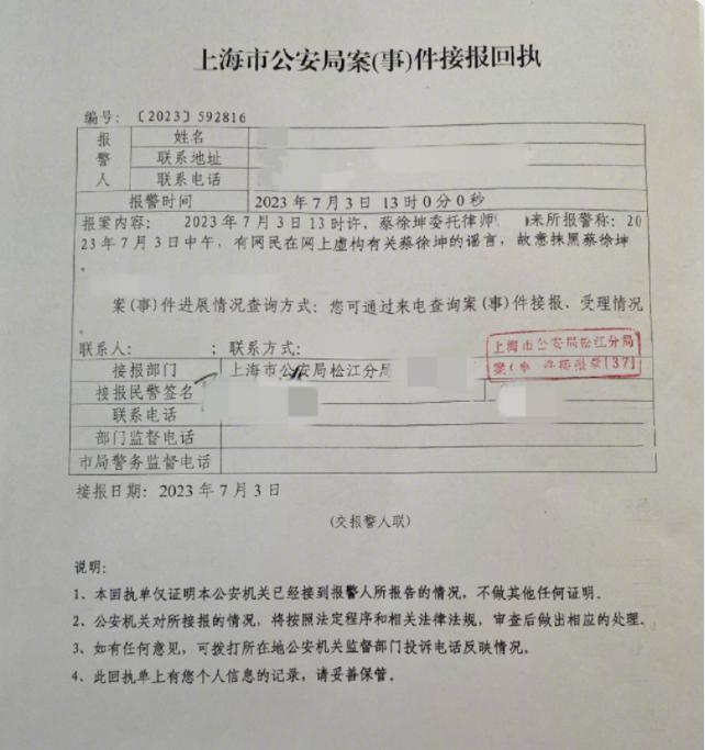 超越了“高效”。蔡徐坤委托的天尚律所的报警时间为2023年7月3日13点整。“亲密照”爆出17分钟后,蔡徐坤的律师就已经拿着蔡徐坤的委托报警了。但网友发现从天尚律所的浦东总部到松江公安局,得开1个小时车才能到。