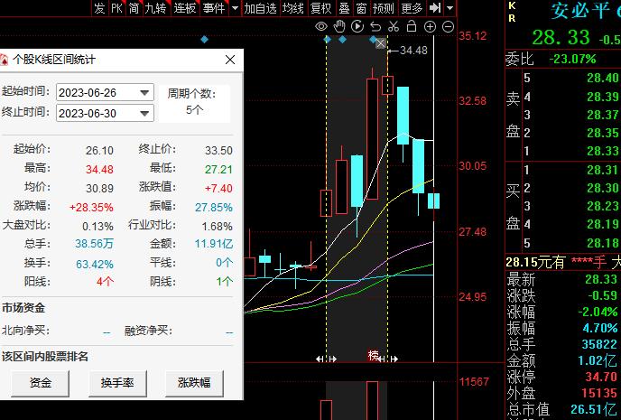 低点之后,安必平股价开始反弹,2023年6月30日创下34.48元的阶段高点。不过,经过近3个交易日的连续下跌,安必平股价跌至28.33元。