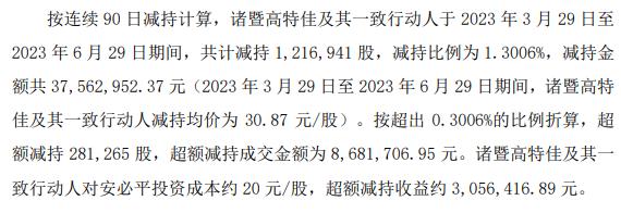 按超出0.3006%的比例折算,超额减持281265股,超额减持成交金额为868.17万元。诸暨高特佳及其一致行动人对安必平投资成本约20元/股,超额减持收益约305.64万元。