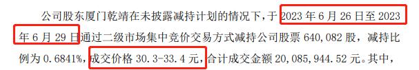 具体来看,厦门乾靖在未披露减持计划的情况下,于6月26日至6月29日,减持安必平股票640082股,减持比例为0.6841%,成交价格30.3元/股-33.4元/股,合计成交金额约2008.59万元。