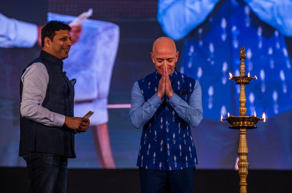 △ 亚马逊创始人贝佐斯前往印度时双手合十,表现出融入印度文化的姿态。(图源:社交媒体)