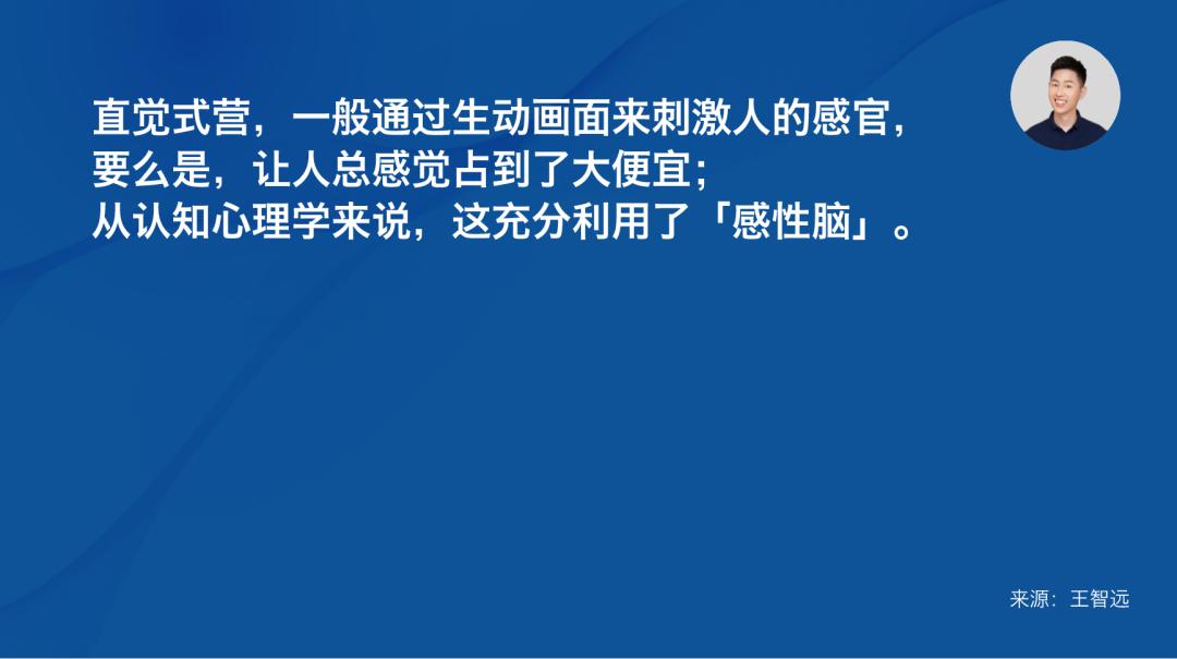 所以不难发现,直觉式营销一般通过生动画面来刺激人的感官,要么是,让人总感觉占到了大便宜;从认知心理学来说,这充分利用了人的「感性脑」。