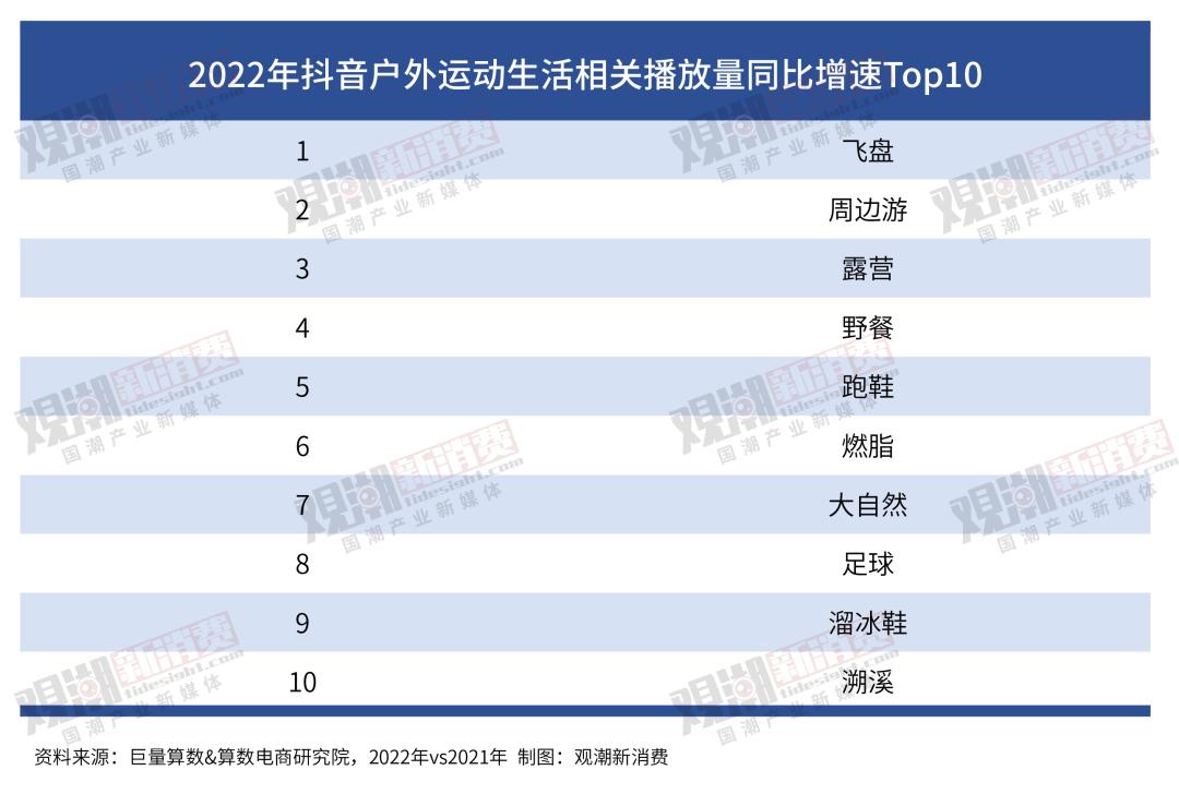 抖音公开数据显示,2022年户外生活板块,与运动相关的短视频播放量超过3700亿次,点赞超过92亿次;2022年“抖音921好物节”期间,抖音电商运动户外相关商品成交额同比增长156%,飞盘的成交额同比增长883%,露营相关成交额增长1596%。由此可见,户外生活正在影响互联网用户的日常生活,并真正有效地将需求转化为消费。