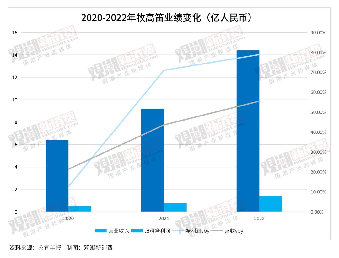 牧高笛作为国内露营帐篷代工及品牌龙头,同时经营OEM/ODM及自主品牌业务,自主品牌分为主打专业露营装备的大牧及主打泛户外鞋服的小牧。公司年报显示,2021年后疫情带动露营火热,公司步入加速成长期。2021年公司收入9.2亿元(+44%),归母净利润7861万元(+71%),其中代工/品牌业务收入分别为6.2/3.1亿元,同比增长28%/90%。2022年公司收入14.4亿元(+55.5%),归母净利润1.40亿元(+79%),其中前三季度外销/内销收入6.3/5.2亿元,同比增长22%/152%。