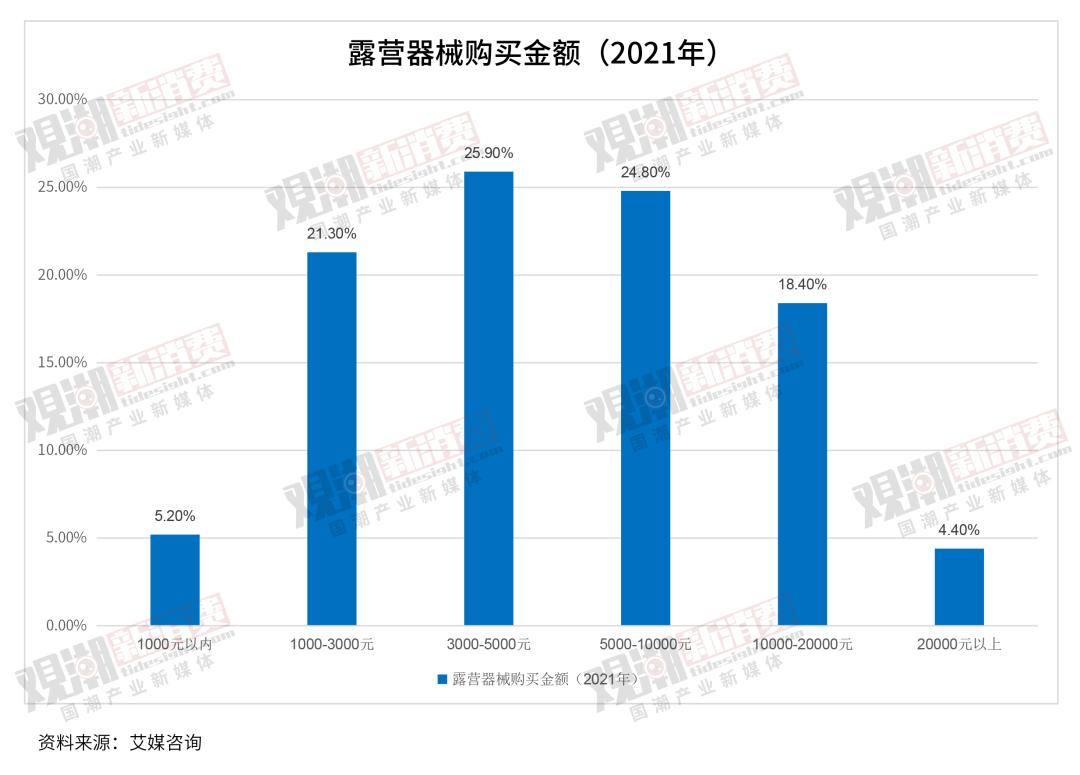 根据艾媒咨询数据,2021年中国露营消费者平均在露营器械上的花费金额为6995元,花费金额大于5000元的占47.6%。
