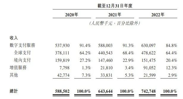 在数字支付服务业务快速增长带动下,连连数科总收入从2020年的5.89亿元增长至2022年的7.43亿元,年复合增长率为12.3%。