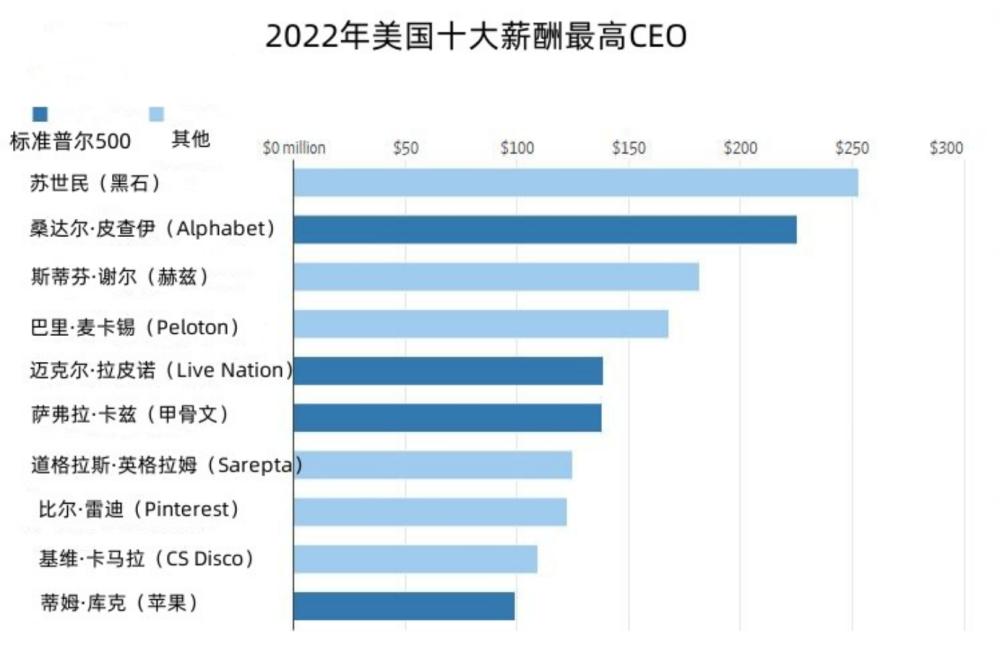 - 2022年薪酬最高的美国公司CEO是黑石集团首席执行官苏世民,他的薪酬达到2.53亿美元,但其中大部分为附带权益和股票期权奖励。