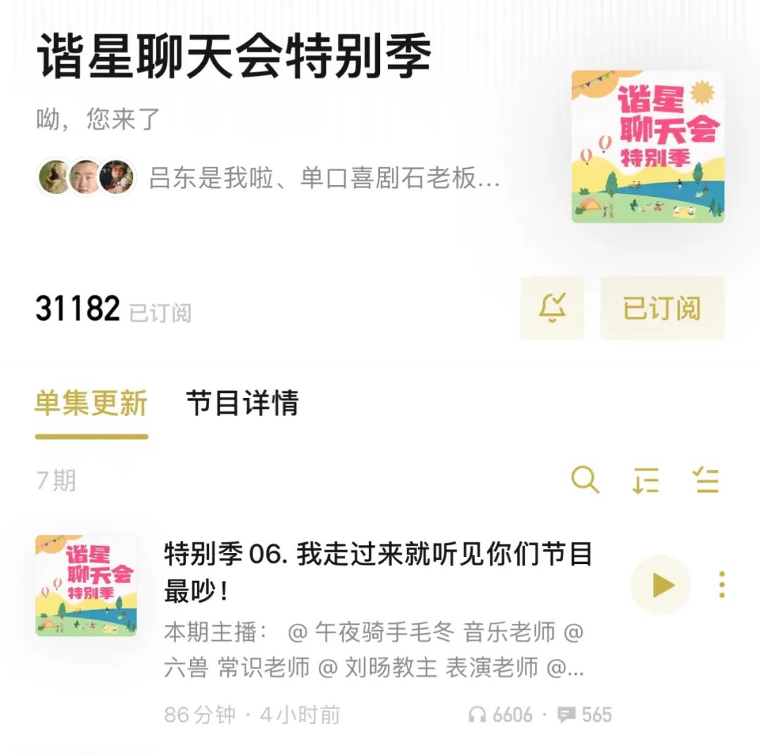 单立人的“顶流”播客节目《谐星聊天会》在今年也推出了付费特别季,售价99元,售出当天就突破了万人订阅,截至发稿前,已有31182人订阅了该节目。