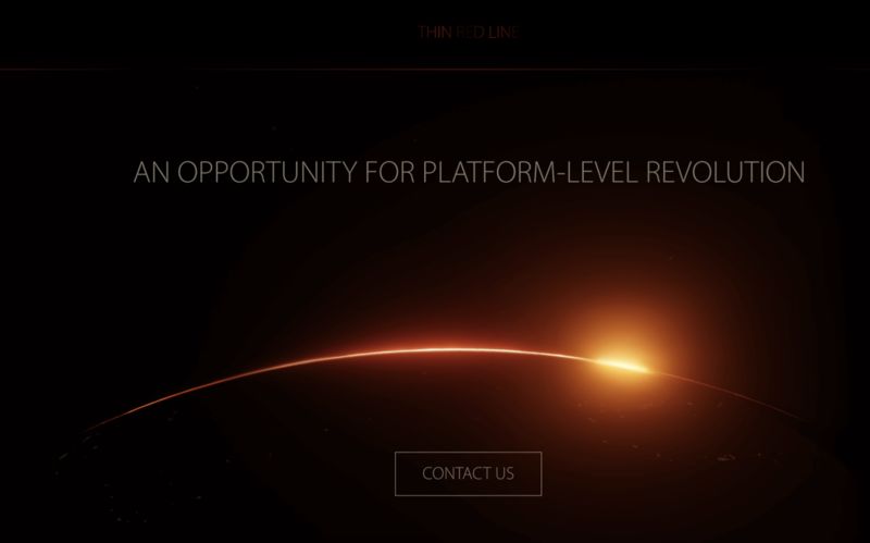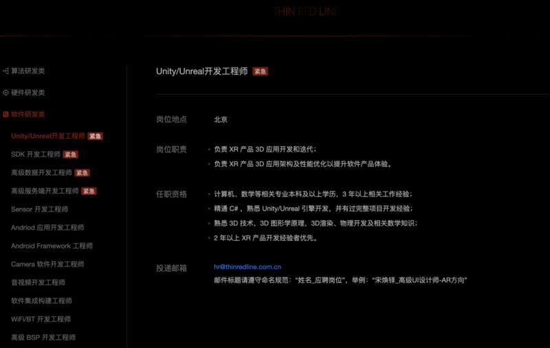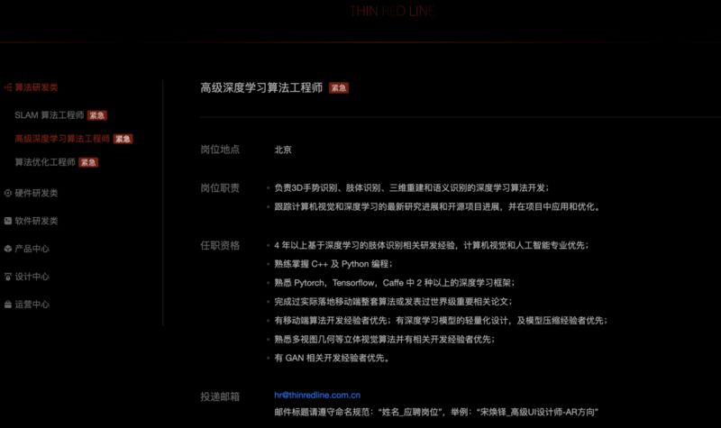 打开「细红线」(THIN RED LINE)官网,只有一句「AN OPPORTUNITY FOR PLATFORM-LEVEL REVOLUTION」(一个平台级革命的机会)。点击下方的「CONTACT US」(加入我们),会看到多份招聘信息,涵盖了硬件、软件、算法、设计、运营、产品等多个方面。并且多个职位都标注了「紧急」。