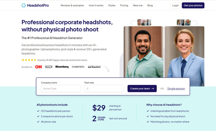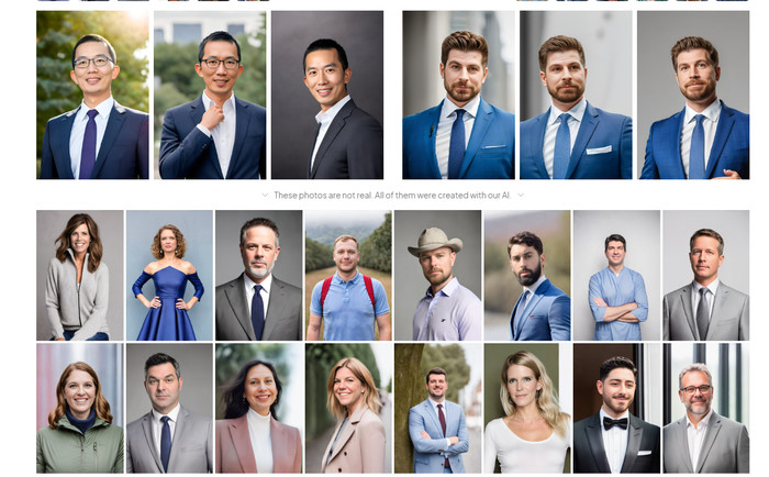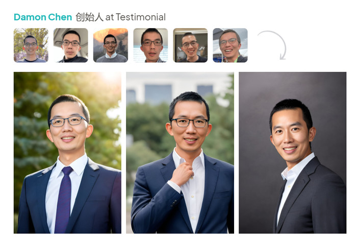 HeadshotPro的官网上,呈现了输入的多张自拍照生成的企业职业照,用于样张的效果展示。