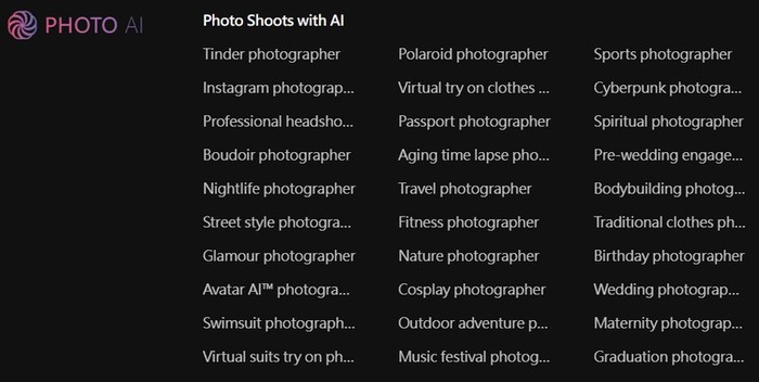 Photo AI 将不同类别的照片作例以摄影师来分类,用途不限于专业类别如时装、体育或专业级人像照,即使是业余用户也可以借 AI 生成的照片令自己社交媒体形像更加吸引,例如用于 Instagarm、Tinder、旅游、健身、野外探险等,令外人看见意想不到的一面。