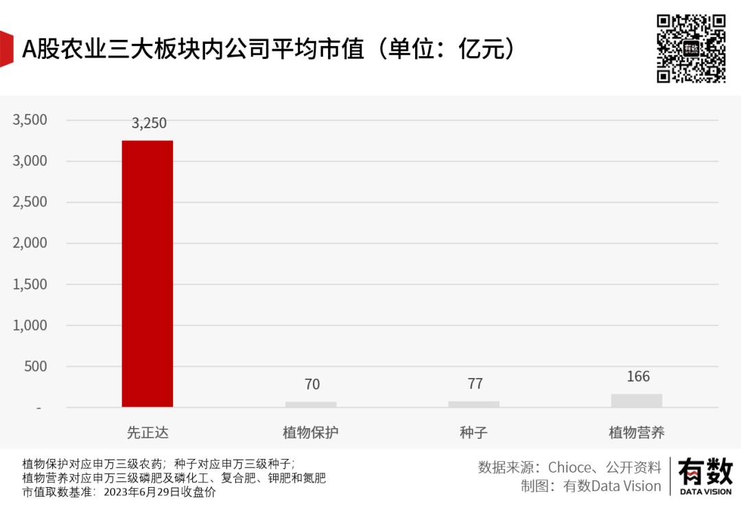 先正达的上市还将改变整个A股农业板块的格局。通常农业大致分为植物保护(农药)、种子和植物营养(肥料)三大板块,而在先正达上市之前,三个板块单家公司的平均市值分别仅为70亿、77亿和166亿元。