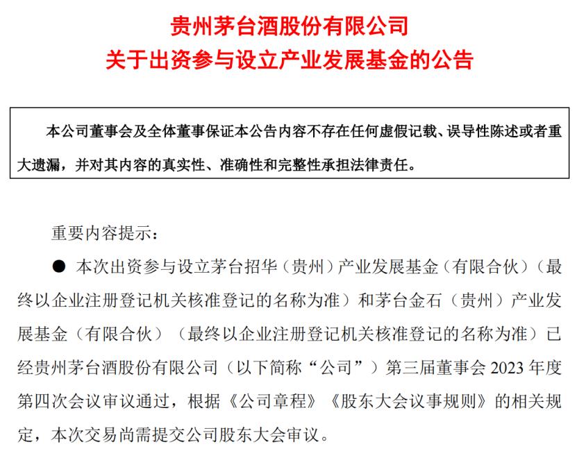 6月13日下午,在贵州茅台股东大会上,出资参与设立产业发展基金的议案获投票通过。