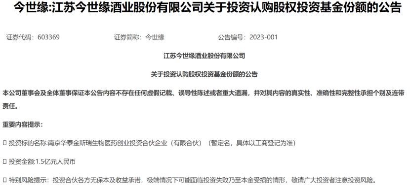 同月,今世缘发公告称,拟投资入伙南京华泰 金斯瑞 生物医药创业投资合伙企业,后者主要聚焦医疗健康、生命科学技术等方面;今世缘拟出资1.5亿元,占比15%。