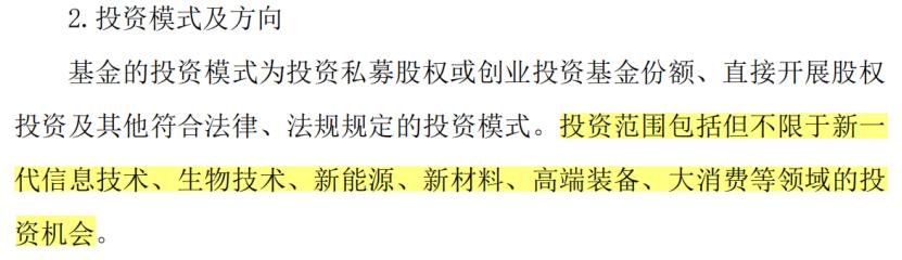 前述贵州茅台参与设立产业基金的公告中,也专门提及投资方向为 “生物技术、新一代信息技术、 新能源、新材料、高端装备、大消费等领域”。