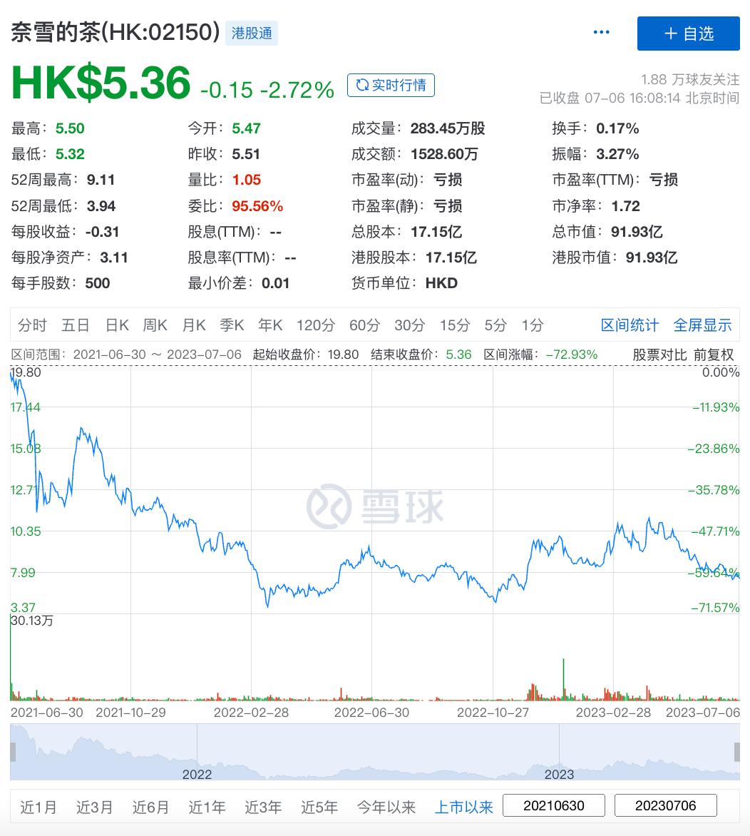 但奈雪上市后的成绩并不理想,上市当日即破发,此后股价一路下滑,从2021年7月1日的开盘价18.86港元/股跌至5.36港元/股(截至7月6日收盘),市值蒸发超228亿港元。