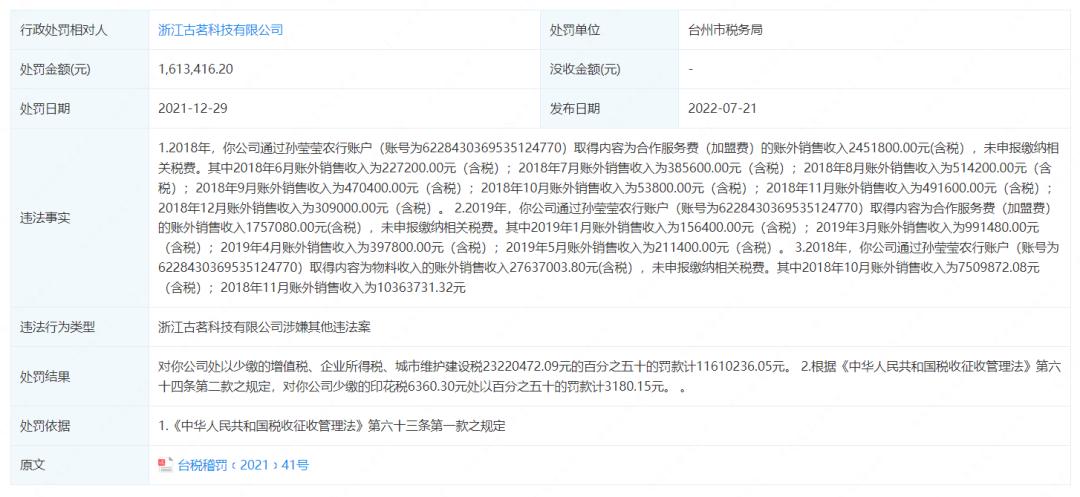 同样是在2021年,古茗被曝出偷逃税款,并被台州市税务局处以1161万元的罚款。