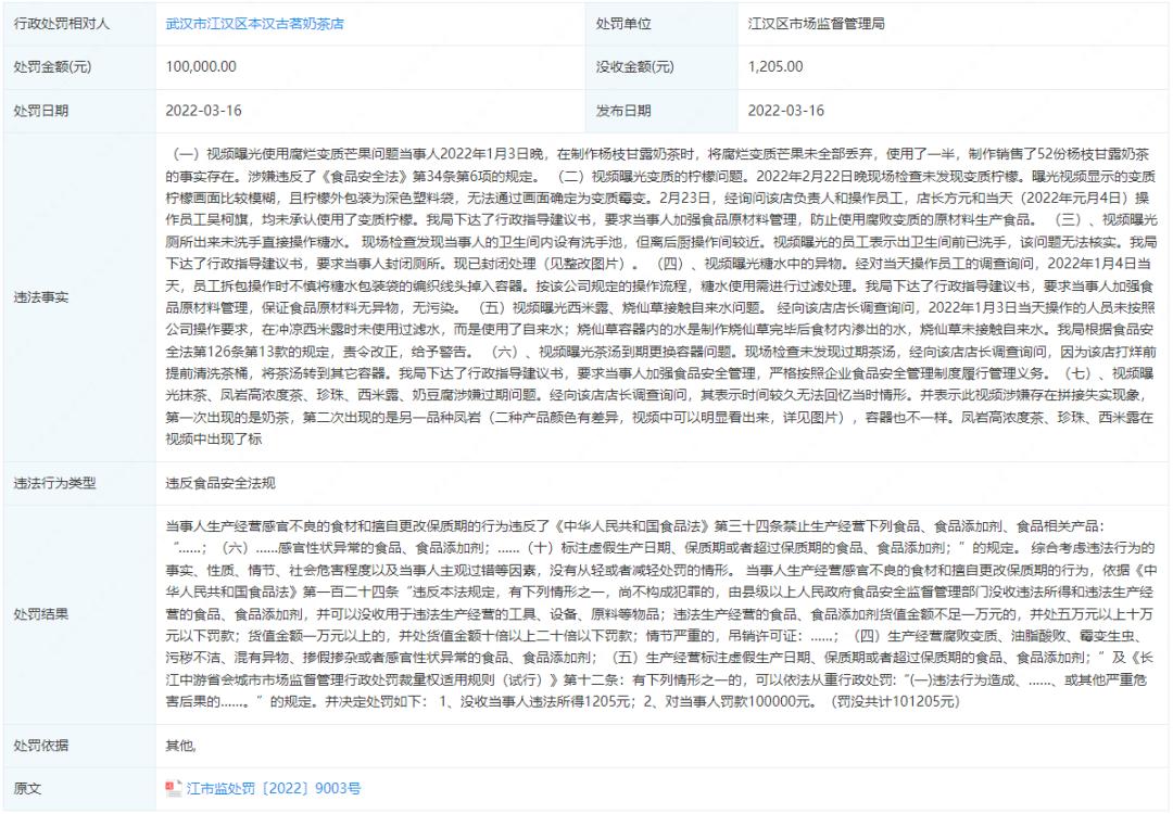 今年3·15期间,武汉市江汉区的古茗门店因生产经营感官不良的食材、擅自更改保质期,被市场监管局依法没收违法所得、施以行政处罚。此后又有工作人员在网络上晒照,声称自己会在备料时偷偷吃掉一部分水果,不少网友为此担心起食材的卫生状况。