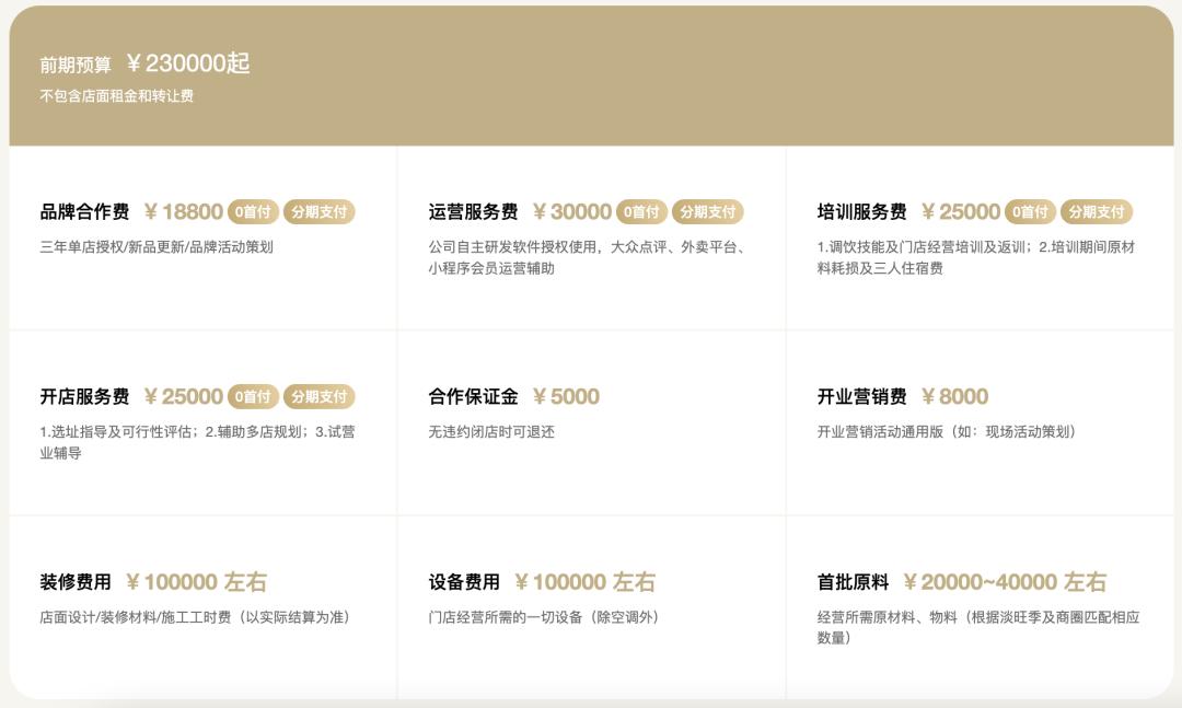 当然,据官网所示的加盟费用来看,前期预算23万元起,再加上品牌授权费、各类服务费、装修、设备、保障金等费用,想要开一家古茗至少得花56万。相比之下,蜜雪冰城的加盟总费用大概在40万左右。