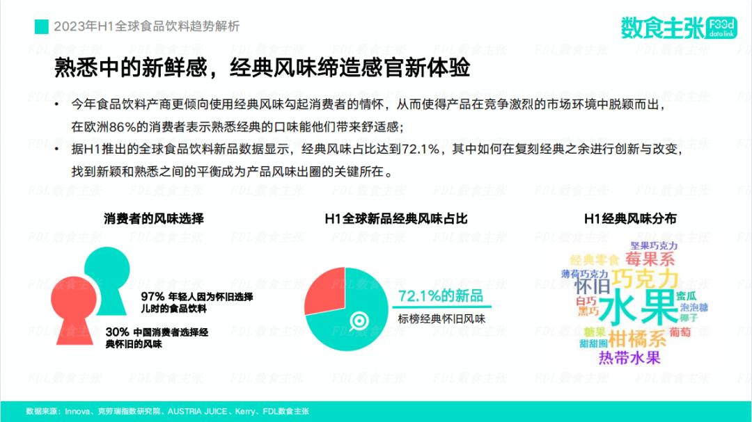 为了满足消费者对怀旧风味的追求,今年越来越多的食品饮料品牌倾向于使用浓烈且浓郁的风味来塑造怀旧味道。根据2023年H1全球食品饮料趋势显示,其中经典风味占比达到72.1%,主要体现在水果、巧克力、怀旧零食等风味上的创新与融合。