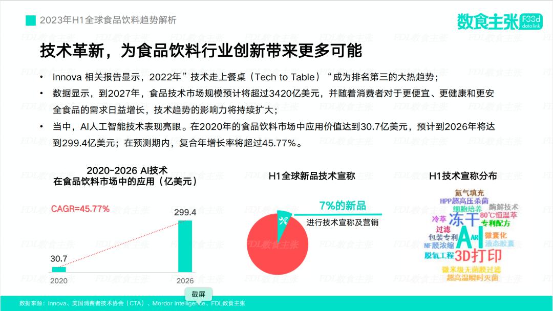 根据2023年H1全球食品饮料趋势显示,全球有7%的新品进行技术宣称及营销,除了AI人工智能技术,3D打印技术、冻干技术、细胞培养等等创新技术也正在逐步渗透到食品饮料的产业链中。
