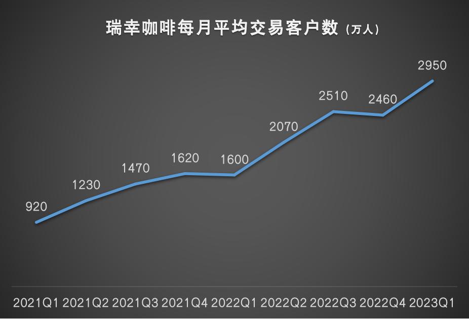 瑞幸的月均交易客户数(即消费用户数),从2020Q1的661万人,到2023年Q1已经涨到2950万,相当于爆雷前的4.5倍。