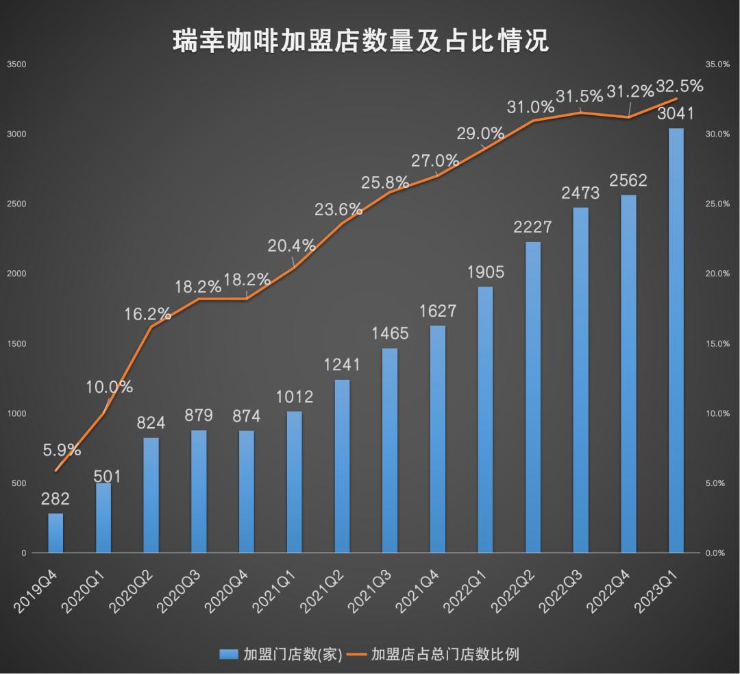 瑞幸2020年初曝出财务造假,直到2021年才重启加盟,2022年加盟比例直线上涨;发展到今年一季度,近一万店里,接近三分之一是加盟店。
