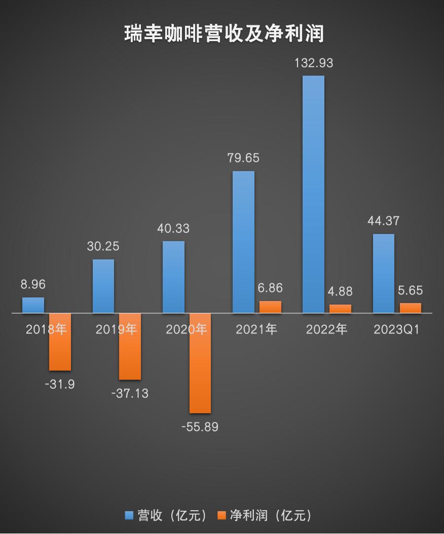 到2021年,瑞幸接近盈亏平衡点。扣除重组费用以及1.8亿美元(约合人民币12亿元)SEC和解费用,调整后净亏损为216万元。2022年瑞幸真正扭亏为盈,收入规模首次突破百亿元,营业利润首次盈利,达到11.56亿元。