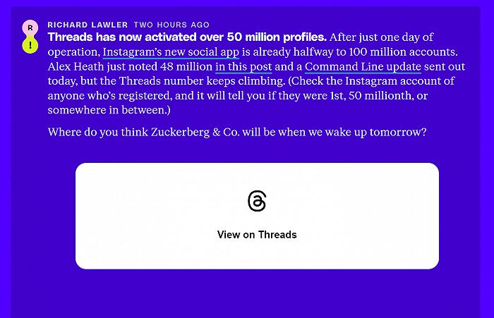仅上线一天多,“Meta版推特”Threads注册用户已超过5000万。据科技媒体The Verge当地时间7月6日报道,新上线社交应用Threads已注册激活用户超过5000万,该数字仍在持续增长。