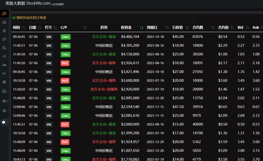 该交易员在单笔大宗交易中买入了约83,000份10月18日到期的VIX看涨期权合约,支付了约450万美元,同时卖出了约27,700份执行价为27、到期日相同的VIX看涨期权,以抵消成本。