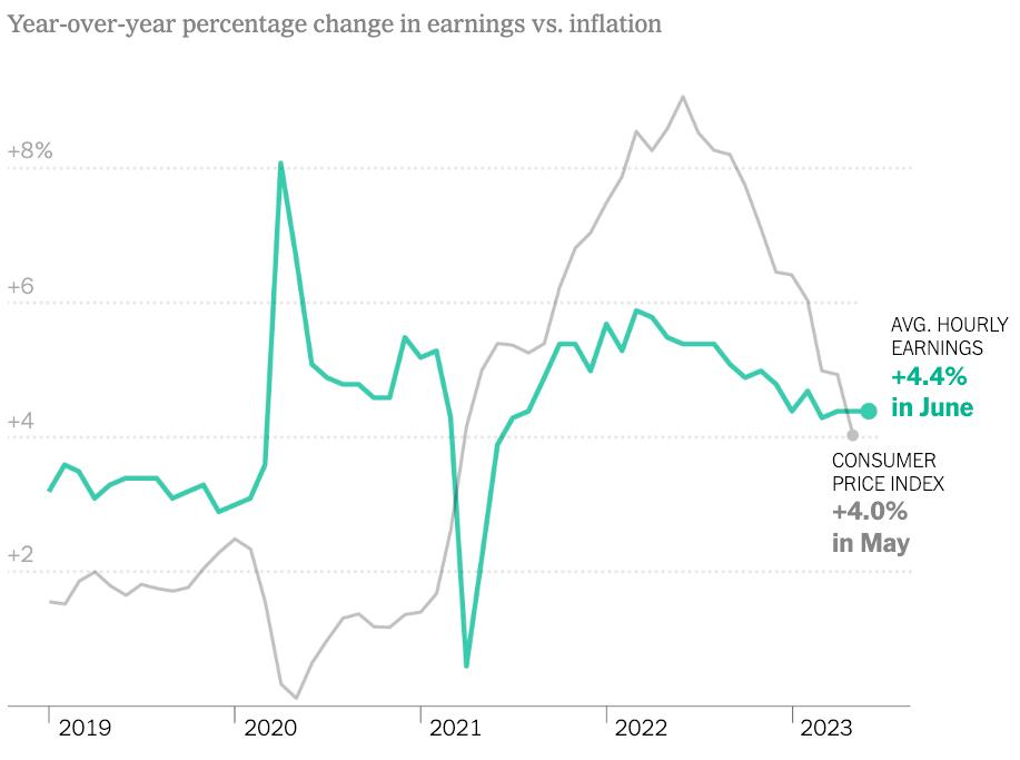 失业率从3.7%降至3.6%,平均时薪环比增长0.4%,高于预期。这使得工资同比增长4.4%。这是自2021年以来首次超过物价涨幅。