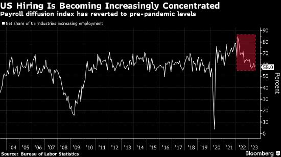 更为重要的是,招聘活动越来越多集中在少数几个行业。衡量招聘活动行业分布的就业扩散指数在2022年2月见顶后已经基本回到疫情前水平。