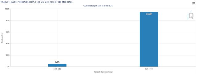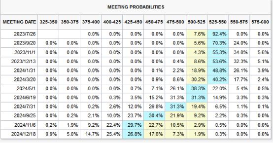 CME的FedWatch工具显示,联邦基金期货反映出7月26日加息25个基点的可能性为95%,较非农数据发布前的92%有所上升,也表明加息“板上钉钉”的前景根本没有改变。