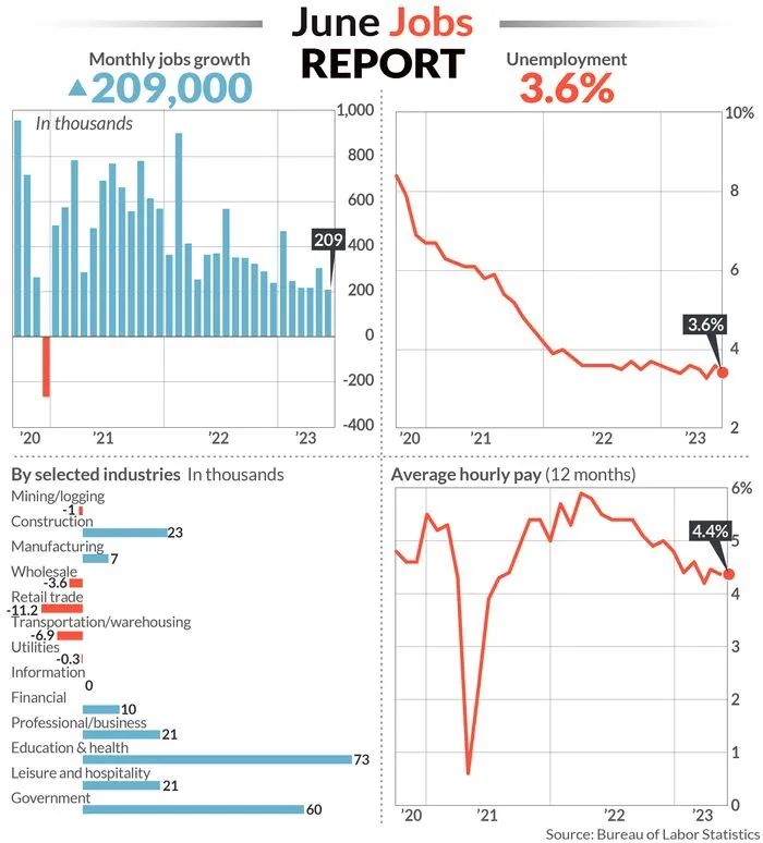 6月份非农就业人数增加了20.9万人,这一强劲但弱于预期的数据被投资者视为一个受欢迎的发展,这是自2020年底以来最小月度增幅,而且前两个月数据被向下修正,表明就业放缓程度比预期更甚。