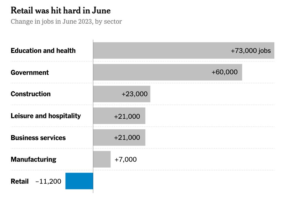 在经历了2020年和2021年的巨大爆发之后,与商品创造、运输和销售相关的行业似乎正在经历回调。零售业、运输业和仓储业的就业人数在6月份都有所下降。但一直滞后的证府部门就业岗位,随着服务业的蓬勃发展,出现了强劲增长。