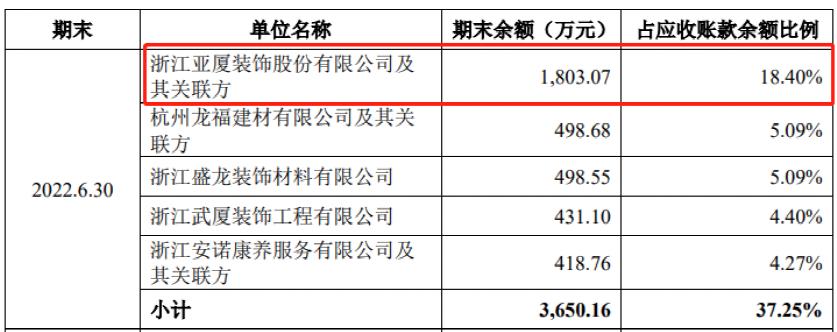 从2022年上半年的情况看,这种影响已然体现。首先是2019到2021一直是公司第一或者第二大客户的装修装饰企业亚夏股份,2022年上半年未再进入公司前五大客户之列,反而应收账款还增加了大几十万元,到了1803万元。因“踩雷”恒大,2022年4月发布年报的亚夏股份突然曝出近10亿亏损。