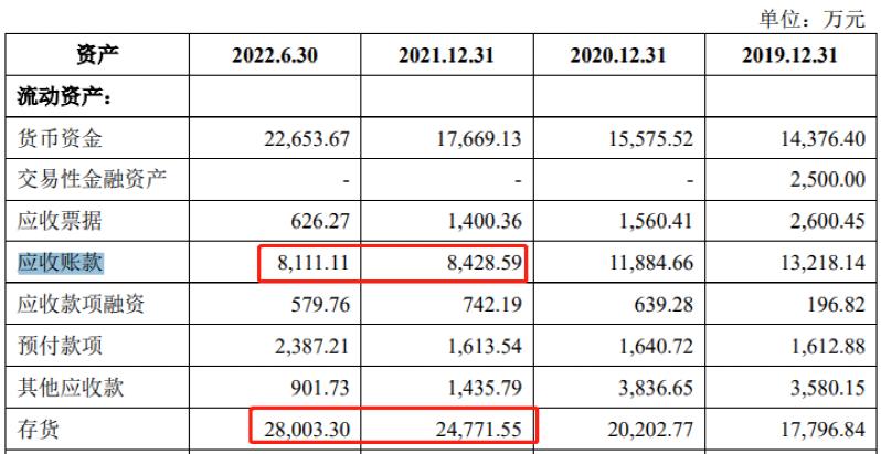 其次,公司的整体应收账款和存货上升较快。截至2022年半年末公司应收账款是8111万元,已经和2021年全年末接近;存货也一样,2022半年度末的金额达到2.8亿元,而此前各年度末也仅是1.78亿、2.02亿和2.48亿元。