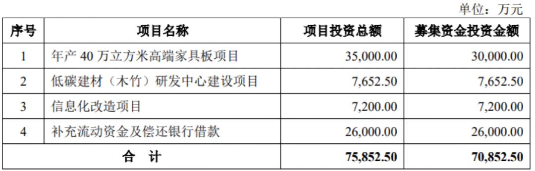 公司本次拟投资项目的投资总额约为7.59亿元,拟投入募资约7.09亿元,主要募投项目包括年产40万立方米高端家具板项目、低碳建材(木竹)研发中心建设项目、信息化改造项目、补充流动资金及偿还银行借款。需要指出的是,公司的补流及还贷金额占比已经高达募集资金总额的36.7%,非常罕见,这或与公司负债率高企流动资金紧张有关。