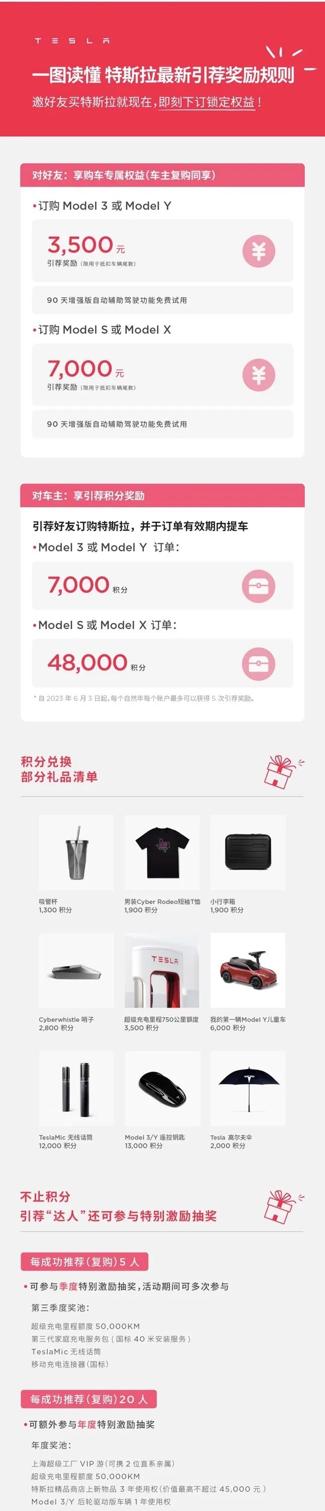 此外,每成功推荐(复购)5人或20人,还可参与季度或年度特别激励抽奖,其中,年度奖池内含Model 3/Y后轮驱动版车辆1年使用权等。