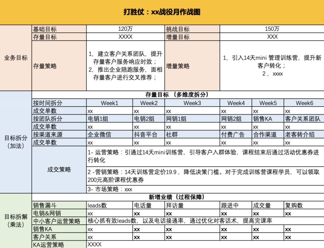 根据业务流程,确认每个环节要关注的重要指标和转化率后,就可以放到业务的月度作战图,进行跟踪和策略的优化迭代。