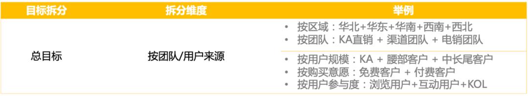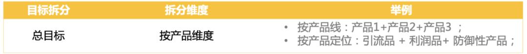 比如,为什么品类A要完成4000万的业绩,而不是2000万或1000万 ?可能是因为A品类是今年公司希望主打的产品,经过前期调研,能够解决市场上尚未满足的某个用户群体的痛点,且市场空间也足够大等等,总之是具备扛起来完成4000万的子目标的能力。加法拆分是从纵向的维度,从上到下进行目标的拆分的。