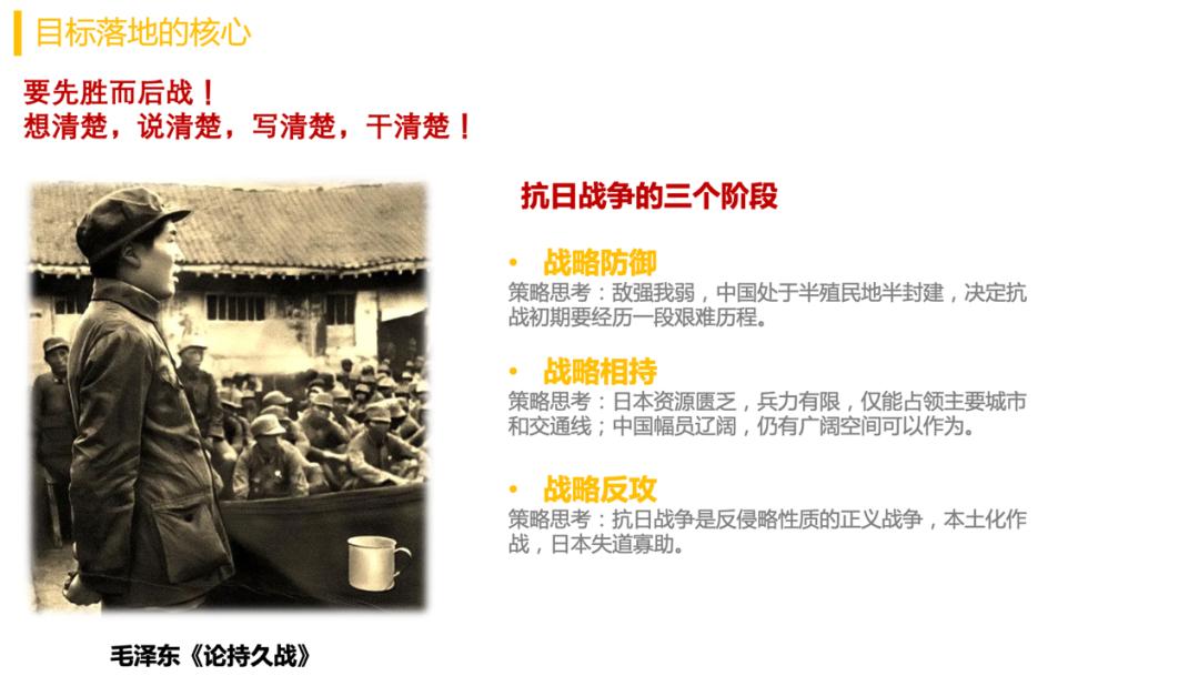 对于目标来讲,要能够想清楚,说清楚,写清楚,才能够干清楚!定义合理的目标,并进行有效的拆解,可以帮助业务团队做到未战先胜,先胜而后战。就像中共在抗日战争的初期,毛泽东就洞察了这场抗日战争的本质,并发表了《论持久战》,论述实现战争胜利的三个阶段。