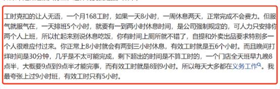 小莓所在的门店,排班5小时,中间排休1个小时,如果排到晚班要打烊,又需要多干1~2个小时,相当于4小时工资干6小时活。