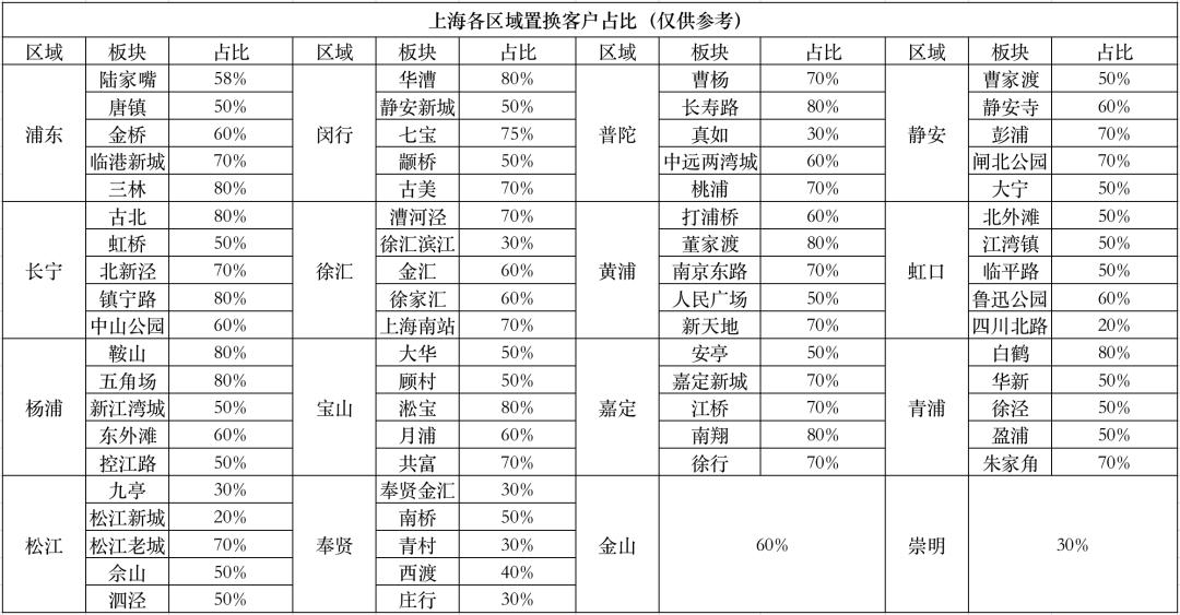 可以看到除崇明、松江九亭、奉贤金汇这样比较偏刚需的板块外,上海大部分板块都是以置换客户为主 。