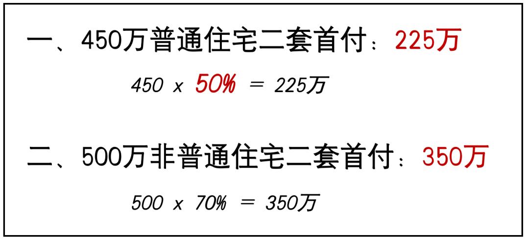 我们以内环内一套总价450万的普宅,以及一套500万的非普宅为例 :第一,针对购买二套住房的首付 。