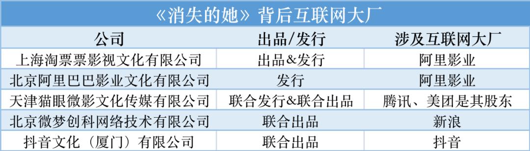 联合出品方北京微梦创科网络技术有限公司,背后则是新浪。法人代表曹菲为新浪集团副总裁。除此之外,腾讯、美团也间接参与了《消失的她》的投资。