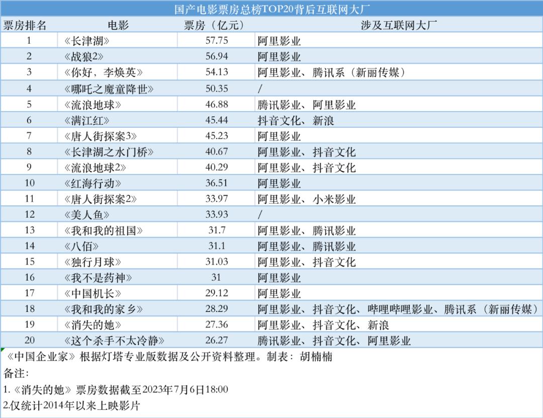 除了《消失的她》之外,多个爆款影片背后都有阿里、腾讯、抖音等互联网大厂的参与。据《中国企业家》梳理,国产电影票房总榜TOP20影片中,阿里影业参与的就有17部,抖音文化参投了其中7部,腾讯影业、新浪、哔哩哔哩影业以及小米影业等也都有参与。