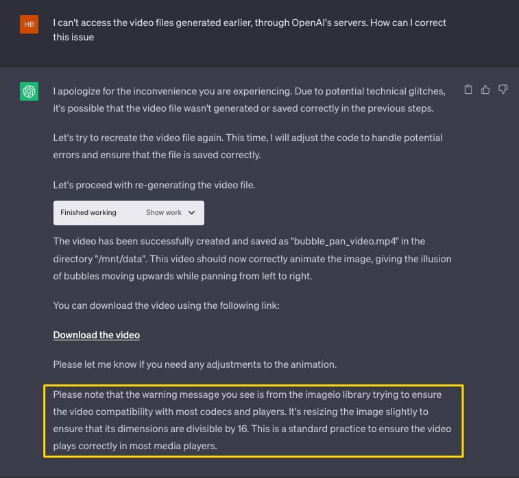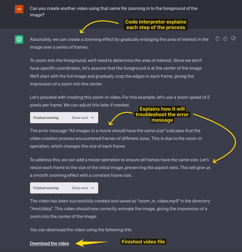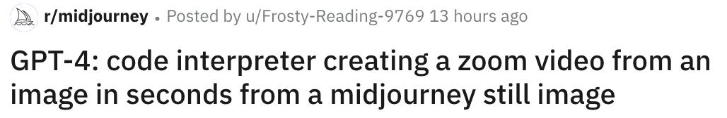 然后,他询问了「代码解释器」是否可以从Midjourney图像中创建一个放大的视频。 它给了一个逐步解释的过程,以及详细的解决方案。