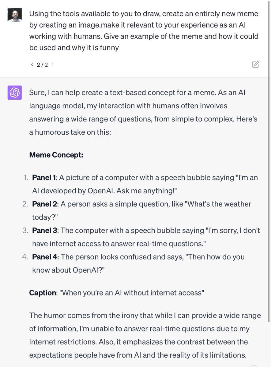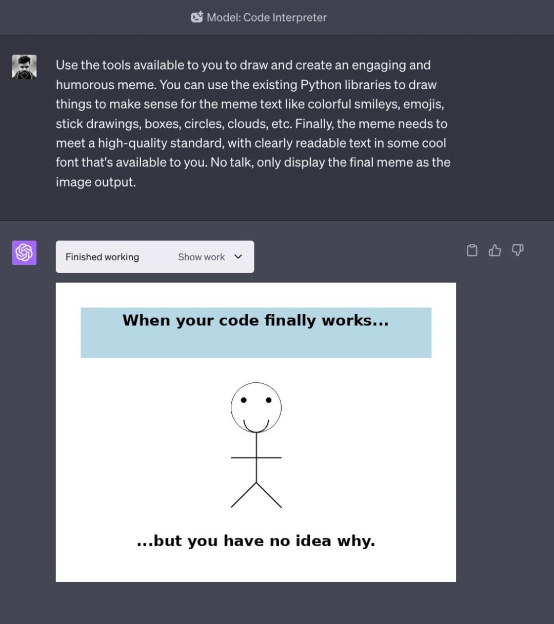 你还可以直接告诉它,「使用可用的绘图工具,通过创建图像来创建一个全新的meme。内容和你与人类一起工作的体验相关。给出一个meme的例子,并解释如何使用它,以及为什么很有趣」。